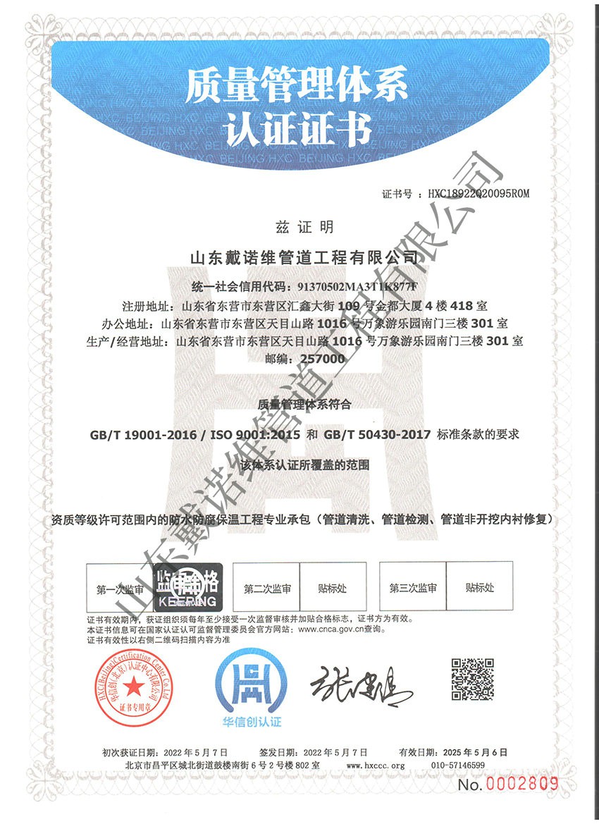 管道非開挖修復(fù)工程服務(wù)企業(yè)資質(zhì)證書